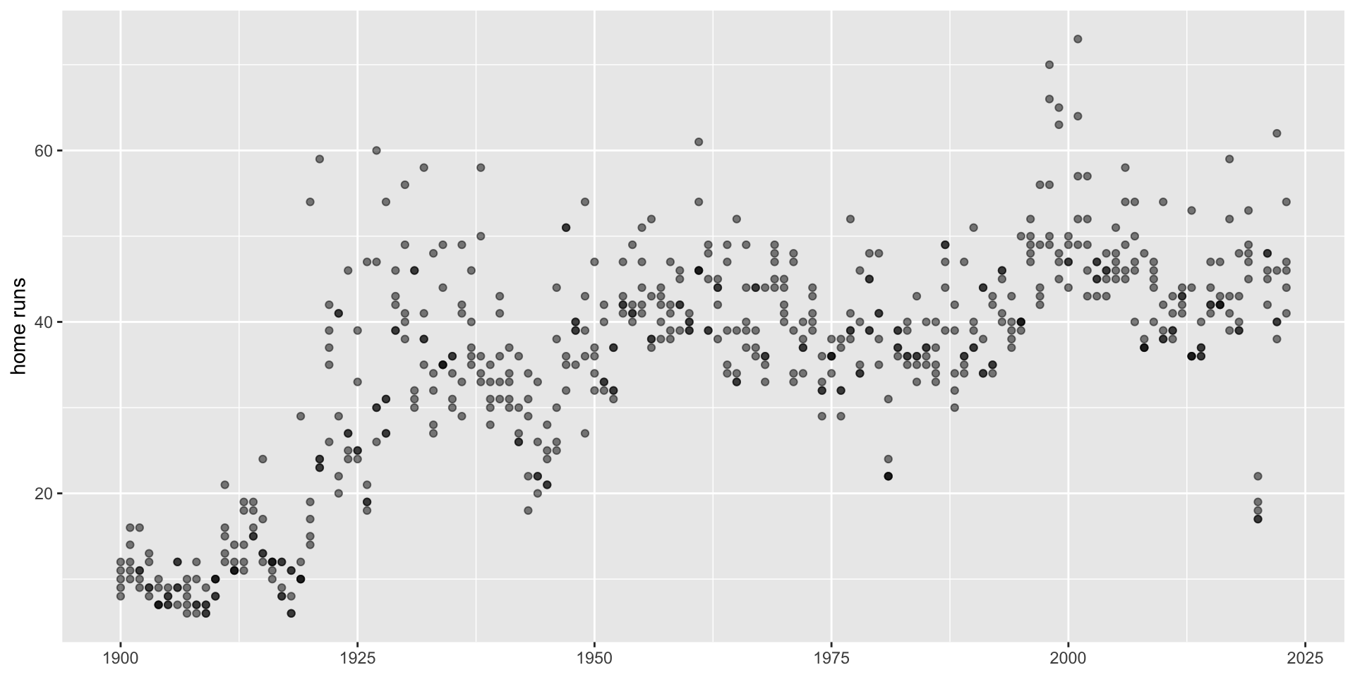 We would like to produce a graph of the number of home-runs hit by each of the top five home-run hitters in the Major Leagues, for each season since 1900.